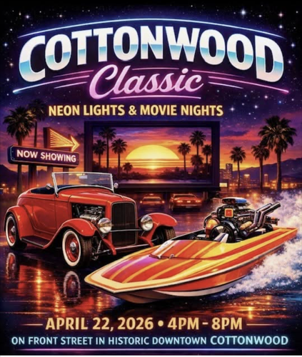 The Cottonwood Chamber of Commerce is proud to announce our first ever Kool April Nites sponsored car show! We’ve partnered with some great Cottonwood businesses to give Northstate classic car lovers another opportunity to show their classic rides during show week. We will have a car show from 4-8pm, followed by our very own drive in movie right on Front Street. Vendors include Hops N Vines for drinks, Hog Oiler BBQ Food Truck for some great grub, Sweet Wheels Ice Cream for some treats, and TLC Kettlecorn to follow with all of your movie needs. We will also be opening this show to the general public, free of admission, once the car show concludes at 8:00PM. Being a classic to park in the classic car section, or a tailgate, chair, or blanket for general seating area. Big shout outs to our local vendors, participants, and sponsors. See you soon!