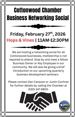 Name: Business Networking SocialDate: February 27, 2026Time: 11:00 AM - 12:00 PM PSTBusiness Networking SocialEvent Description:We are hosting a networking social for all Cottonwood businesses, membership is NOT required to attend. Stop by and meet a fellow Business Owner or Key Employee in our community. We will also be giving a brief induction to our upcoming quarterly business development seminars.