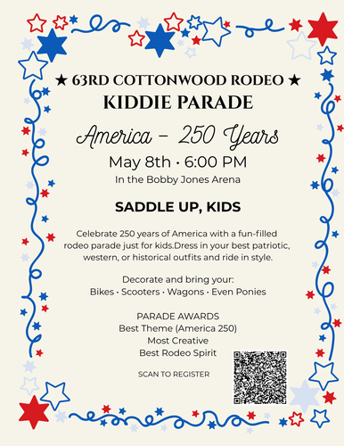 Name: Kiddie Parade & Bed RacesDate: May 8, 2026Time: 6:00 PM - 9:00 PM PDTKiddie Parade Flyer 2026Event Description:63rd Cottonwood Rodeo Kiddie Parade & Bed Races